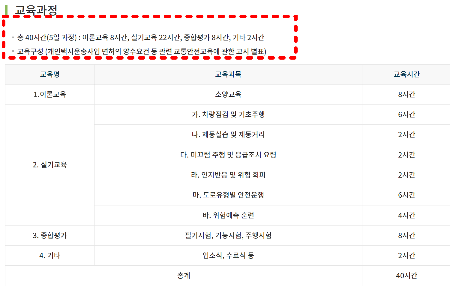 이 교육은 한국교통안전공단이 운영하며, 약 5일 동안 진행되는 40시간의 교육과정을 통해 개인택시 운행에 필요한 기본 지식과 안전 운행 관련 내용을 배우게 됩니다.