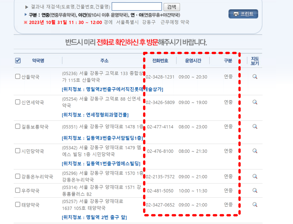 검색하면 아래와 같이 약국의 이름, 주소, 전화번호, 영업시간이 포함된 결과를 볼 수 있습니다.